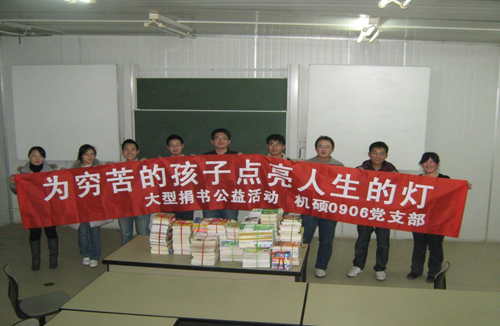 入冬以来,随着“学习实践科学发展观”活动的深入开展,永利3044noc广大研究生党员们纷纷开动脑筋献计策,各班党支部联合筹划了以“冬日暖阳”为主题的系列特色党日活动,机硕0906班党支部在孝感市闵集乡办爱心书屋就是其中的一项,目的是通过支部成员的努力,筹集适合青少年儿童阅读的图书,为贫困乡村的孩子们送去精神食粮,丰富孩子们的课余生活。