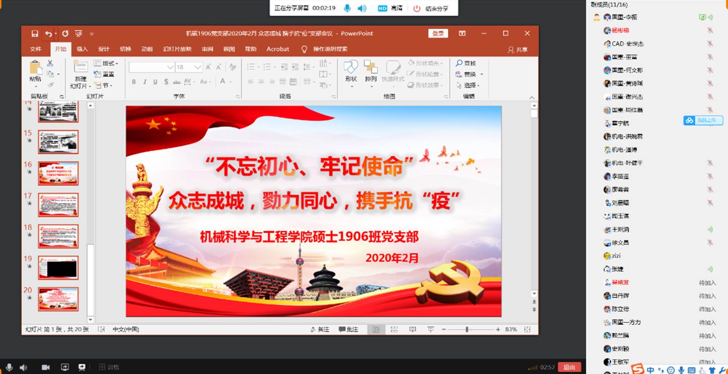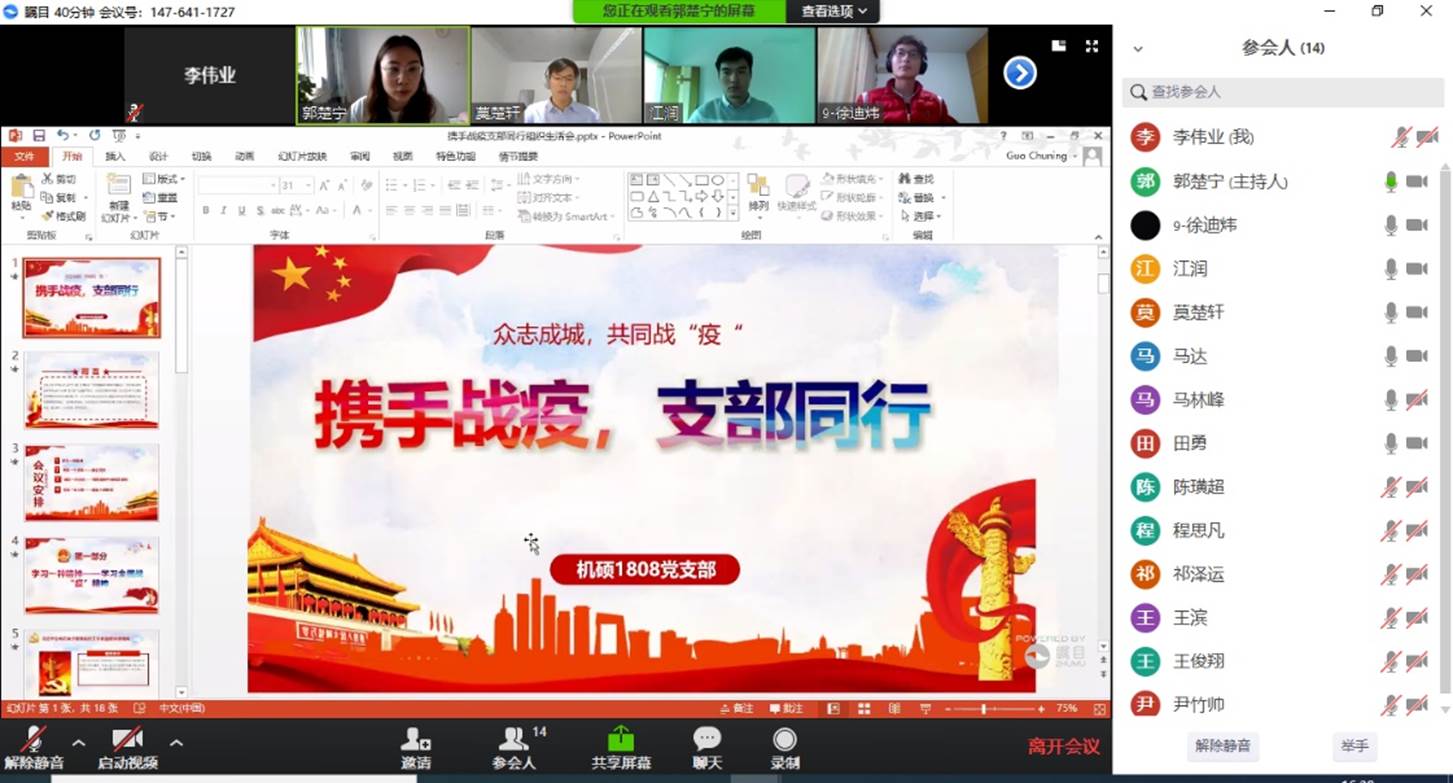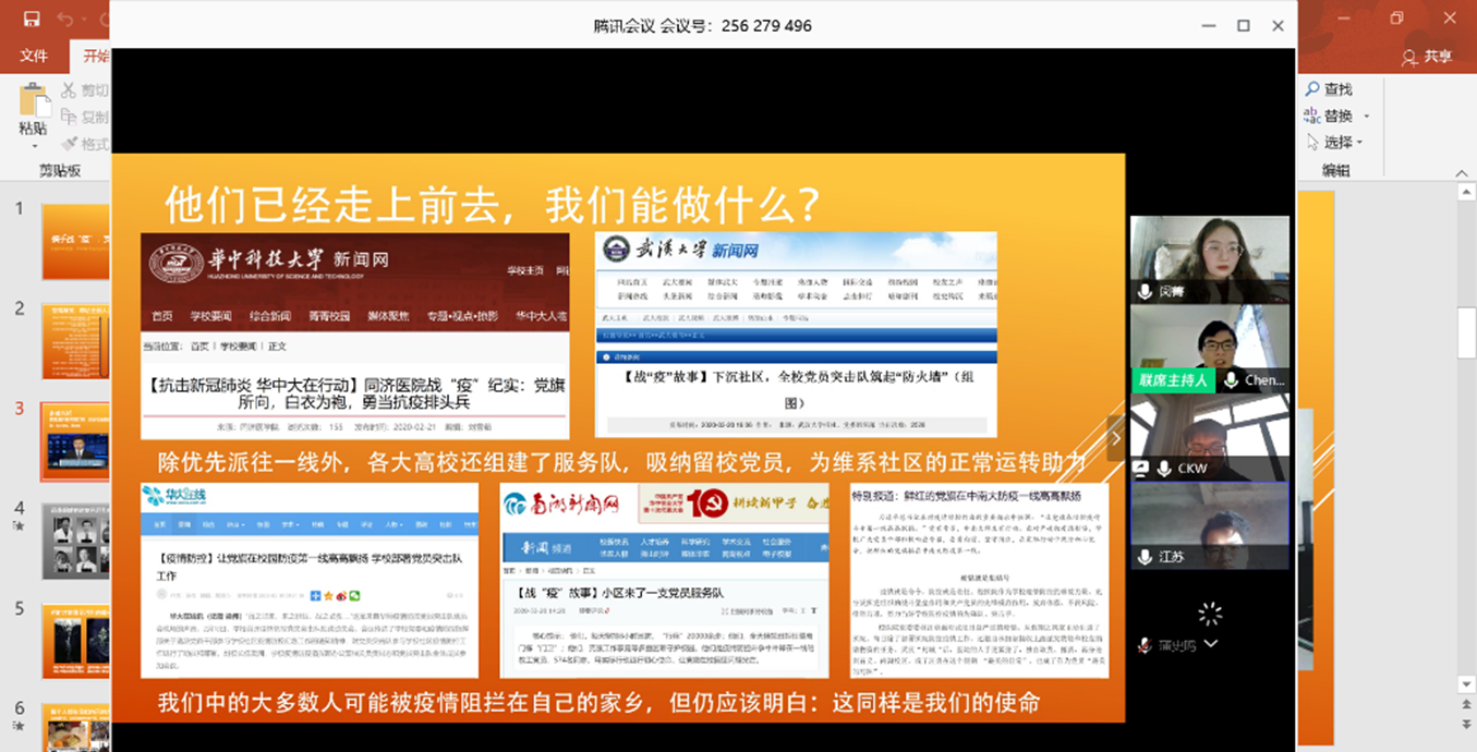 疫情当下,永利3044noc各研究生党支部通过网络组织每位党员学习全国战“疫”精神,要求有所思有所行,并通过召开线上党组织生活会进行集中讨论、思想碰撞,以更深入学习贯彻有关精神和指示。