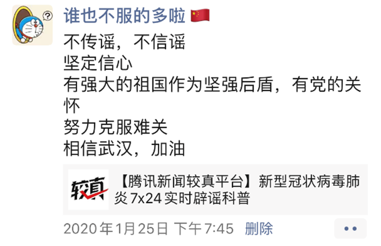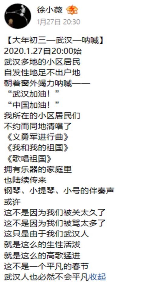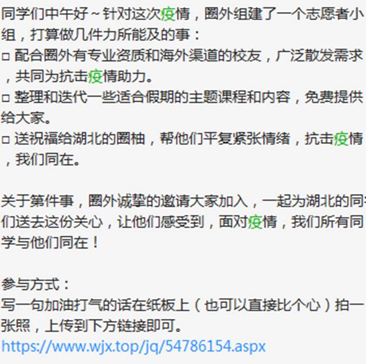 硕士1809党支部柯新月:在湖北人民与新型冠状病毒抗争期间,我参加了一个线上志愿活动:每个人发一条语音或者拍一张与抗“疫”有关的照片。我希望通过这种方式传递温暖和关怀,作为一名中国共产党员,在国家危难之时,挺身而出,责无旁贷。作为一名员工,能力有限,所以我加入志愿者大军,希望发挥集体的力量,传播正能量。