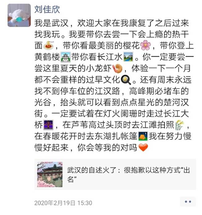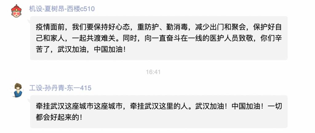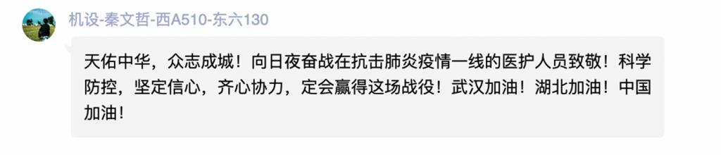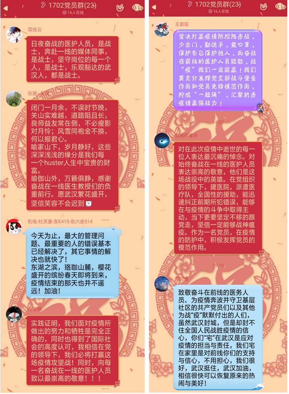 硕士1808党支部马达:感谢在第一线那些为人民服务的勇士们以及付出了宝贵生命的英雄们,同时感谢每一位积极配合抵抗疫情的普通人,中华民族在每次不幸的遭遇中,都万幸有你们这样中华魂的人。我相信,在所有人的共同努力下,这场没有硝烟的战“疫”,我们很快会取得胜利,湖北这只“九头鸟”会涅槃重生,我们的祖国会再次迎来新一轮的繁荣昌盛。