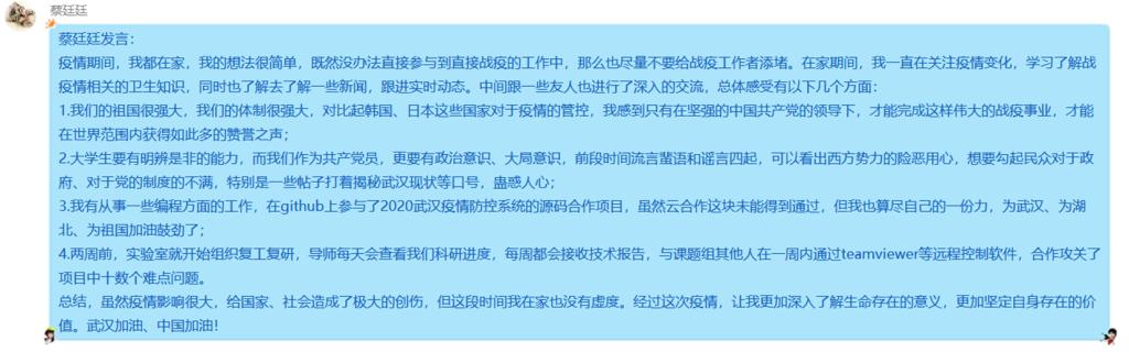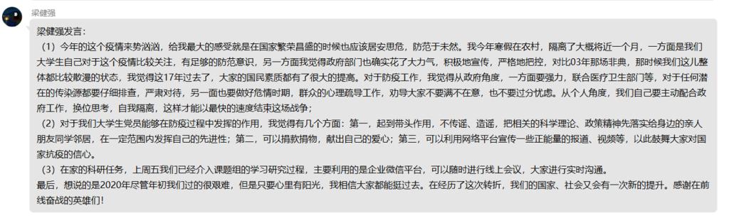 硕士1803党支部包璐胜:在疫情爆发的第一时间,党中央、国务院迅速做出反应,习近平总书记亲自挂帅指挥,提出“疫情防控要坚持全国一盘棋”,全国上下各级党委、政府坚决执行中央命令,驰援湖北并不惜一切代价控制住本地疫情扩散。这场不亚于小型战争的疫情阻击战,让我们看到了我们党强大的组织能力、动员能力,以及应对突发状况时迅速调整应对的能力,也看到了全体人民对以习近平同志为核心的党中央的信任与拥护。目前,得益于全国人民齐心协力、听党指挥,各地疫情控制都取得了较好的成果,我相信我们一定可以赢得疫情阻击战的胜利!