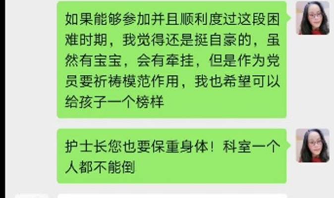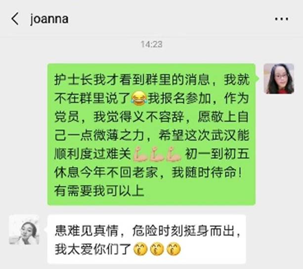 硕士1809党支部江鑫:下面是新冠肺炎发生时我表姐科室招募志愿者的微信聊天记录,我姐说身为一名中国共产党党员,她认为冲在一线是义不容辞的,愿意敬上自己一点微薄之力,并且春节期间随时待命。这不仅是她身为一名护士,秉承医生救死扶伤的觉悟,更是身为一名中国共产党员在国家、人民需要她的时候冲锋陷阵的决心。