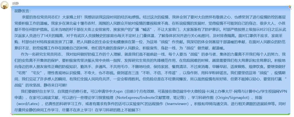 CAD_流体博士党支部乔平:在新冠肺炎发生之后,习近平总书记关于疫情防控的重要讲话给我们指明了防控要点,也给了全国人民强大信心。疫情就是命令,防控就是责任。面对疫情,华中大医学人第一时间冲上了疫情防治的一线,全校也给了最大限度的支持,华中大是全国投入最多床位和医护人员的高校,10家附属医院投入战疫。华中大员工联合起来,积极捐款支援武汉,也为母校和武汉带来了更大的信心。在这场疫情面前,华中大学子响应教育部“守护者”和“识途者”的号召,在家积极做好防护,认真学习,克服困难投入科研,同时也力所能及地为疫情防控做贡献。