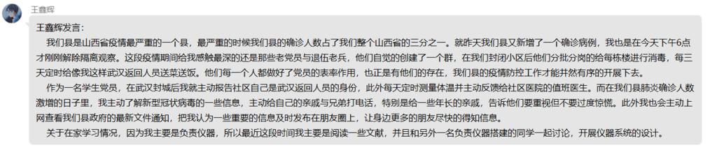 国重博士二支部丁晓军:武汉于1月23日开始封城,同时各个省市也积极行动起来,对武汉回来的人员进行统计和隔离。根据习近平总书记的重要指示,各省市的医护人员不约而同的支援武汉,他们放下手里的工作,告别家人,纷纷支援武汉一线,为打赢这场必须要打赢的疫情攻坚战贡献力量。这时候,每一人都必须做出自己的贡献,守好自己的岗位,守好自己的家人,不传谣,不信谣,不造谣,主动参与到这次疫情的攻坚战中。当下,疫情形势逐渐好转,但我们不能松懈,在这个关键的时期,我们不能心存侥幸,一方面实时关注当前疫情的发展情况,另一方面,坚守自己的工作不放松。最后,希望全国上下齐心协力,争取早日打赢这场疫情攻坚战!武汉加油!湖北加油!中国加油!