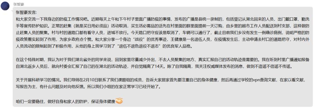 国重博士二支部褚宏昊:武汉归家以来,被隔离观察近20天,简单谈谈居家感受。村卫生室要求早晚量体温两次进行汇报,亲送口罩、消毒酒精,耳提面命,再三嘱咐不要外出访友。派出所进行备案,电话访查,实时关注个人身体状况。村口封路,外来人员禁止入内。这些措施是亲眼所见,亲身经历。防护意识,防护措施落实到位。这依赖于党的执政能力。发挥群众,依靠群众。一线牺牲人员中,共产党员占67%以上,这也体现了共产党员从人民中来到人民中去,为人民服务,不怕牺牲的精神。目前疫情已逐渐得到控制,多个地区连续多天无新增病例。这场疫情防卫战,我们一定能取得最后的胜利!