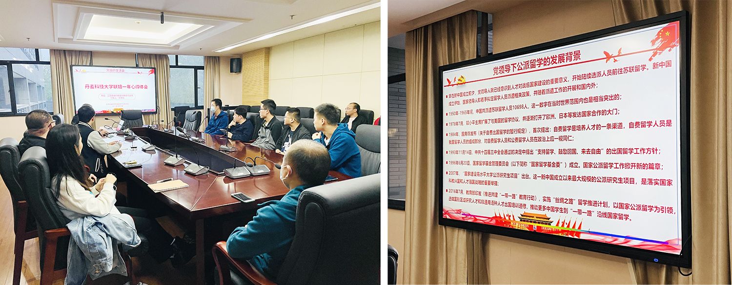 会议邀请了刚结束职工涯的支部成员孙庆磊与大家交流。他阐述了在党的领导下公派留学的发展背景,分享了在丹麦科技大学联合培养的求学历程和科研经验,并对当下关注度较高的公司选择、CSC申请、科研实验室安全等热点问题与大家展开讨论。