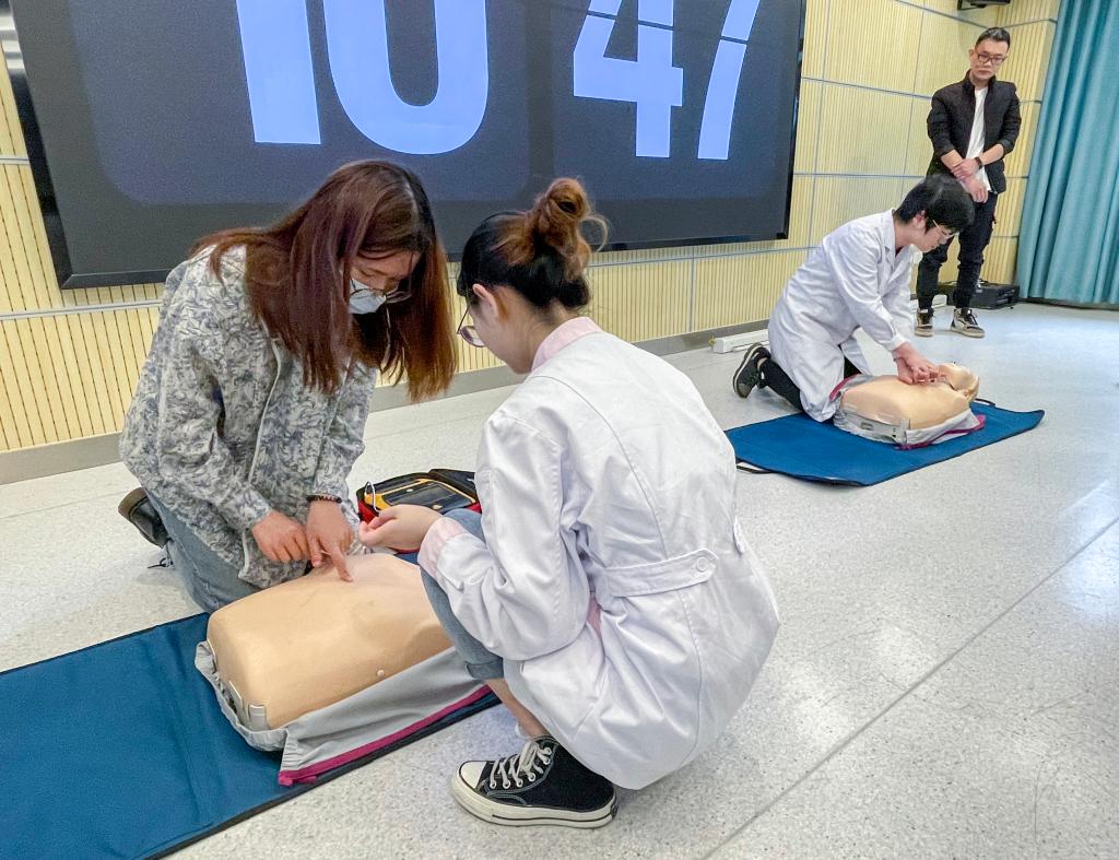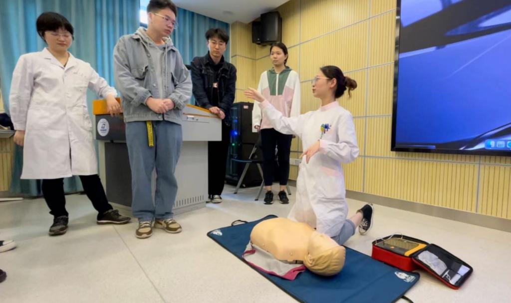 沈佳雪通过对“模拟人”实施心脏复苏抢救操作进行了演示,包括判断是否丧失意识、判断有无自主呼吸、判断有无脉搏、进行胸外心脏按压、清理口腔异物、开放气道、人工呼吸等操作要领的示范。随后,大家在指导下逐一进行了心肺复苏操作实战演练。