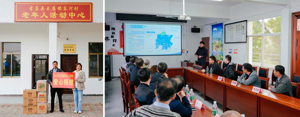 大家一行人首先来到东河村幸福食堂,向幸福食堂捐赠了12袋大米和12壶油,为村民的日常生活提供支持。在东河村党群服务中心,王佳恒介绍了东河村的基本情况、在脱贫攻坚和乡村振兴方面取得的显著成效以及当前面临的一些挑战和机遇。驻村工作队立足公司优势、对接当地需求,积极引进资金,持续推进定点帮扶,在教育、科技、医疗、文化、消费、产业发展等方面开展了系列特色帮扶活动。