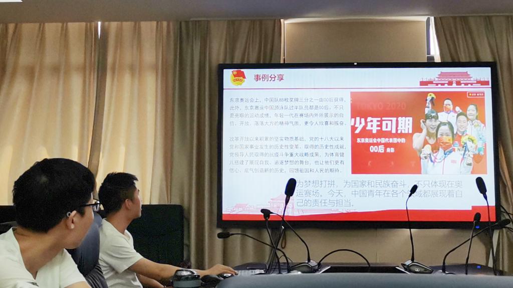 在罗霈生带领下,全体与会成员共同回忆了中国共产党成立100周年大会的辉煌时刻和东京奥运赛场上我国运动健儿们的豪爽英姿。在中国共产党成立100周年大会上,共青团员和少先队员们面向天安门城楼献词,“请党放心,强国有我”的誓词铿锵有力,激励人心;在东京奥运会赛场上,年轻一辈的运动员们取得了88块奖牌的好成绩,他们自信、无惧、拼搏的体育精神令人振奋。