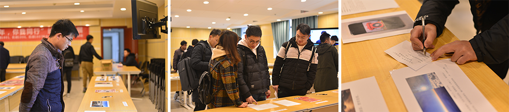 活动在上午10点开展后,接连不断的有同学前来参观展览。本次展览不仅吸引了本院研究生前来观看,还吸引了其他公司的本科生、研究生前来观展。经过仔细观看、相互讨论、反复斟酌。每一位到场参观的同学都选出了自己心中最喜爱的作品,并为它投出了自己宝贵的一票。