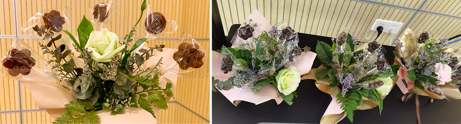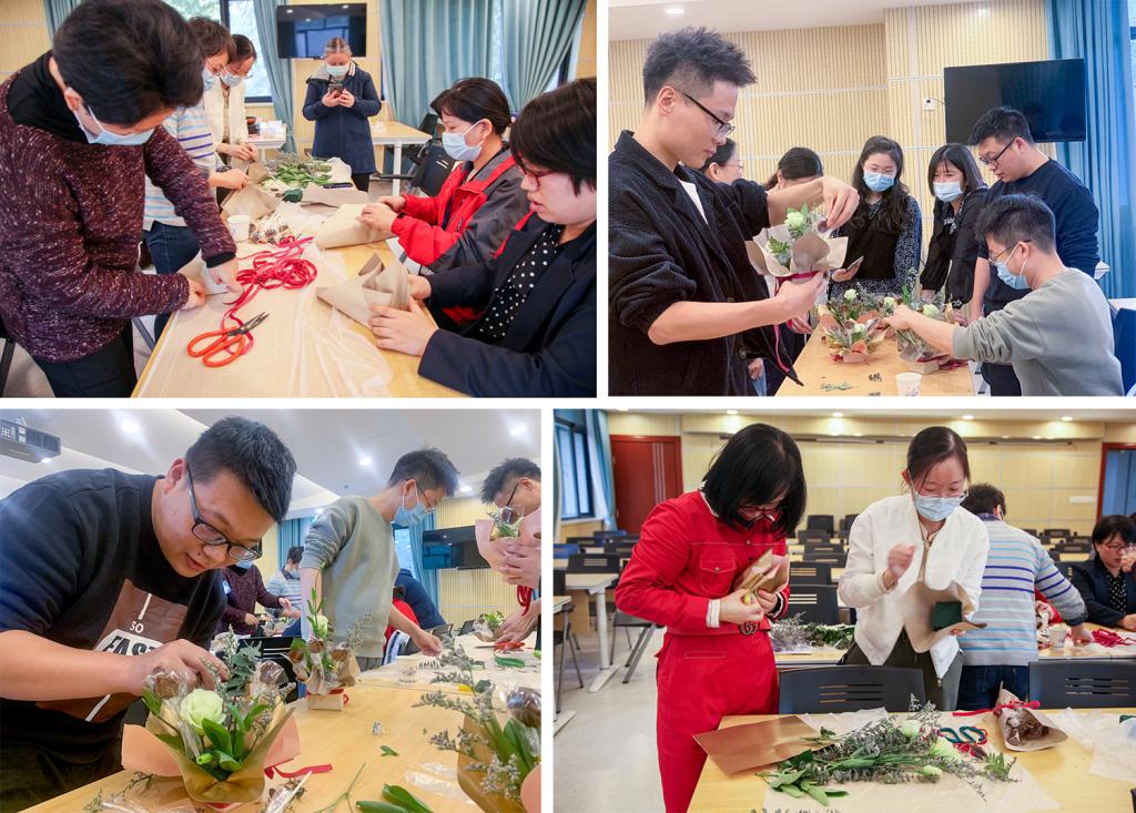 在等待梨膏冷却的时间里,教职工们在老师的带领下开始制作小花篮用于装饰。润肺止咳、生津利咽的梨膏棒棒糖配上精致的花篮,既满足味蕾又美观!制作过程中各小组互相协助,互相观摩,交流经验,拍照留念,纷纷把自己的劳动成果分享给同事、朋友与家人。