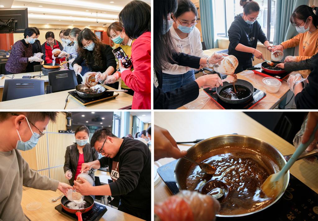 10月23日下午3:00,教职工在机械大楼A304欢聚一堂,认真听老师讲解步骤及制作技巧,在梨膏、珊瑚糖、白砂糖、鲜花、黄芪、生姜、大枣等材料的芳香中,体验手工的魅力。讲解后,教职工们开始分组制作,先将半成品的梨膏加入白砂糖、珊瑚糖搅拌小火熬制,需要往一个方向不停搅拌,是一个考验耐心的过程。待梨膏熬制浓稠状,舀入模具定型,待冷却后脱模,秋梨膏棒棒糖就完成了。