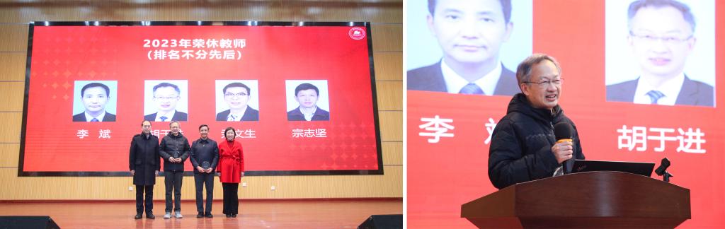 在表彰环节之后,为弘扬尊师重教的良好风尚,增强教职工职业生涯的荣誉感和归属感,公司为李斌教授、胡于进教授举行了荣休仪式。胡于进发表荣休感言,尹周平向他们表示感谢并赠予荣休纪念章。