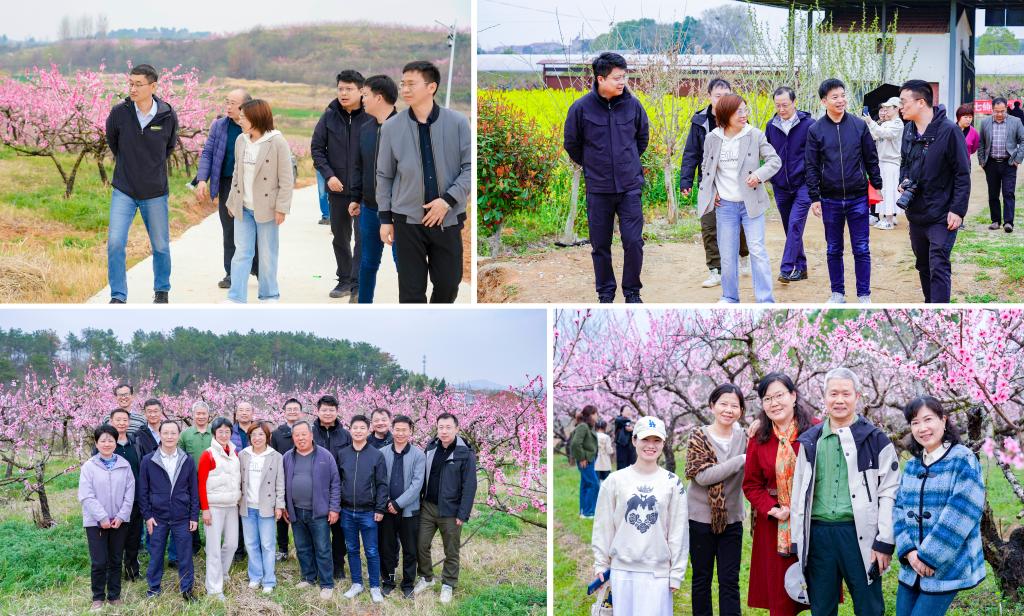 大家首先来到孝昌县七仙红桃园基地,漫步桃园,徜徉在满园灼灼盛开的桃花中,或拍照打卡,或登上观景台欣赏花海画卷。程琪理事长向大家讲述了祖孙三代接力种桃的执着奋斗事迹,大家深受感动。