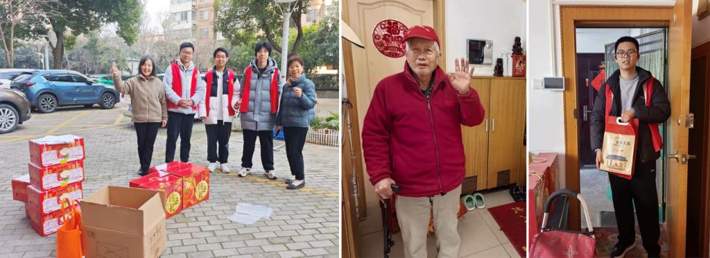 志愿者同学们在离退休党支部老师们的带领下分工明确、协作无间,迅速完成了节日物资的卸运、清点与归置。随后,志愿者们兵分两路,分别前往喻园小区与高层小区,按照预先规划的名单依次开展物资发放工作,现场秩序井然。对于行动不便的老教师,志愿者们主动上门,并耐心询问他们近期的身体状况与生活需求,倾听他们讲述过去的故事。