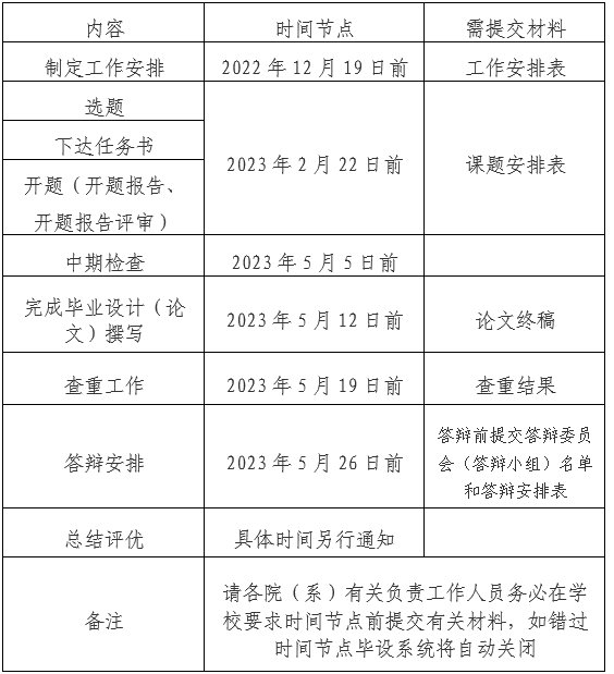 本届毕业设计(论文)工作于第七学期(五年制第九学期)启动,于2023年5月26日前结束。毕业设计(论文)周数,不得低于各专业培养方案的要求。