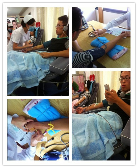 26日下午三点左右,房琳同学来到位于武昌南湖地区的武汉血液中心江南分中心。经过一系列填表、体检、化验等检查工作流程之后,房琳同学在工作人员的引导下于四点进入无菌室开始配合采血。按照采血人员的要求,采血针进入静脉后,房琳要不间断地做松、握拳动作,以利于血液流通。而与捐献全血不同的是,成分献血是在捐献者献血的同时,让血液经过严格消毒的、一次性使用的密闭管道,通过血液分离机分离采集出所需要的某一种成分,然后再将其它血液成分回输给捐献者。因此,成分献血所用的时间要长于献全血,此次采血过程大约耗时一小时。适当休息后,房琳同学即搭车返校。