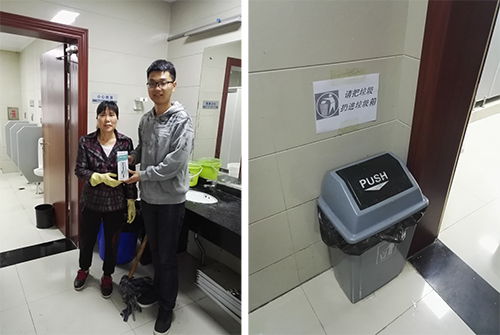支部党员还向公司保安和保洁人员表达了谢意,感谢他们的辛勤劳动,为大家创造了良好的工作、学习环境。在交流过程中吴阿姨说向我们反映,有些同学为图方便,随手将垃圾丢在垃圾桶的周围。针对这一情况,支部成员在垃圾箱旁边贴上了文明提示语,提醒同学们注意环境卫生,尊重他人的劳动成果,减轻保洁人员的工作负担。