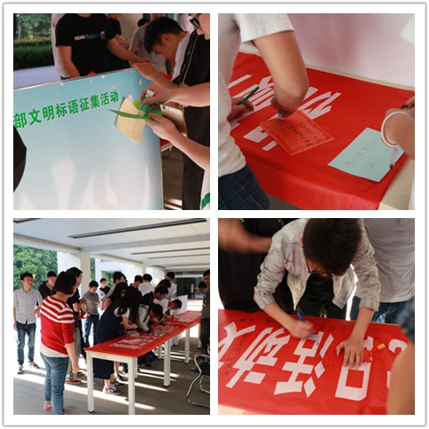 活动在机械大楼二楼平台开展,支部成员每人写一条文明标语,并且粘贴在展板上进行展示。同时,支部成员还在活动横幅上签名,积极响应“构建文明校园”的号召。除了支部的成员外,许多路过的同学也参与了活动,在横幅上留下自己的签名。