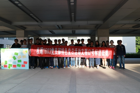 为了积极贯彻习近平总书记在全国高校思政工作会议上的重要讲话中”坚持立德树人”的精神,落实“两学一做”学习教育,响应校研工部开展的“红色楷模”评选。5月2日,永利3044noc机硕1603班党支开展了文明标语收集与展示活动,此次活动是该支部开展 “承优秀文化,建文明校园”特色党日活动的第二部分活动。