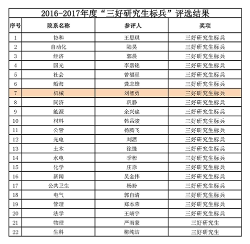 永利3044noc“三好研究生标兵”是永利3044noc授予研究生个人的最高荣誉称号,要求研究生在政治思想、学业、工作能力等方面表现突出。全校各公司产品单位需各推荐一人作为“三好研究生标兵”候选人,硕士研究生、博士研究生均可。本次评选受到各院系的高度重视,包括同济校区在内的35个研究生院参加了本次比赛,活动共评选出三好研究生标兵20位、三好研究生15位。