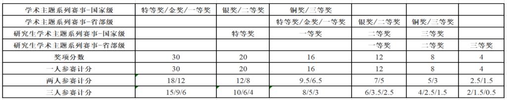 国家级比赛特等奖计20分/项;一等奖计16分/项;二等奖计12分/项;三等奖8分/项;