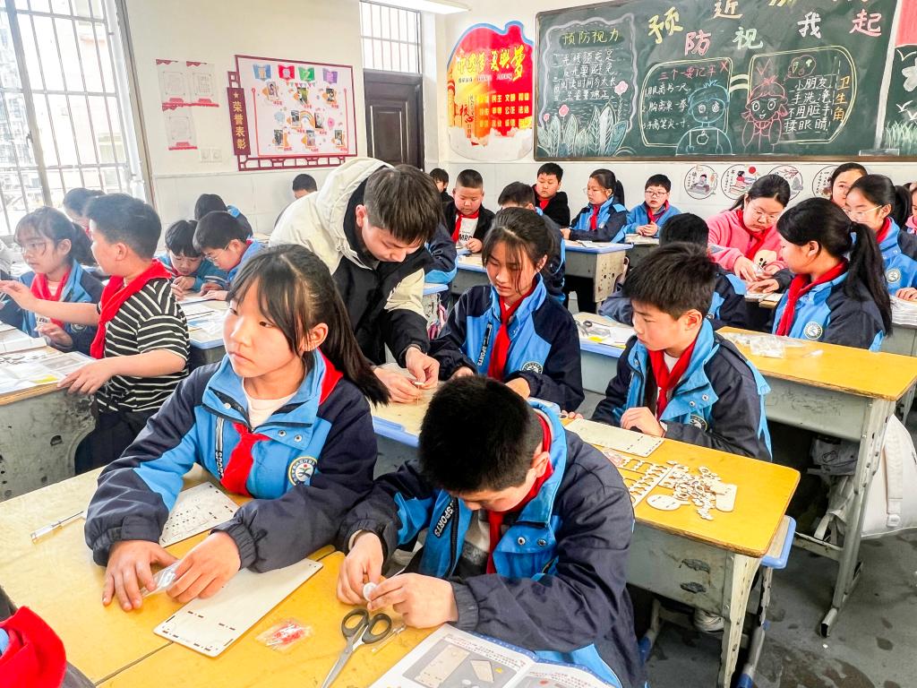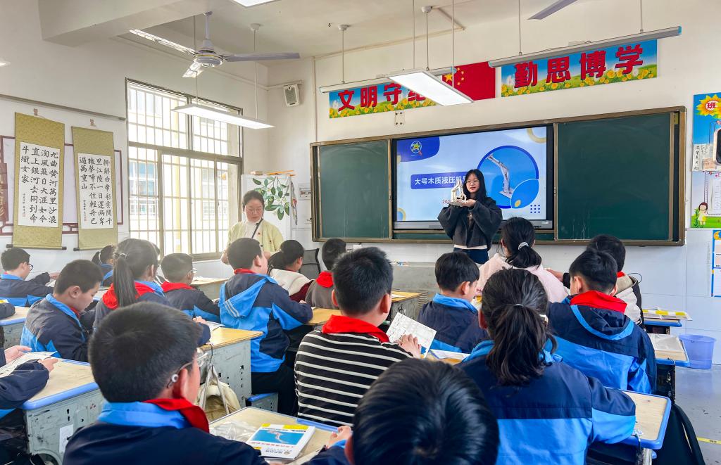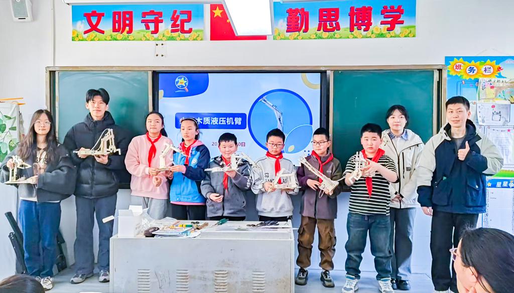 在动手实践环节,孩子们分组拼装液压式起重机模型,体验工程与物理的奥秘。公司2024级硕士生朱星晨通过大屏幕逐步演示拼装步骤,其余队员则走到孩子们当中,手把手协助他们完成拼装。