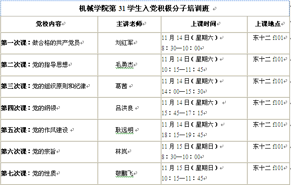 6、11月14日上午第一节课请各位学员提前三十分钟(8:00)到场。党校结业考试内容:党章及时事政治;时间:11月15日晚上20:00—21:30;地点:东十二教学楼f101,f102(请大家提前做好准备,严格遵守考试纪律)。