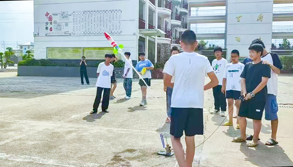 待安装完毕后,周围的同学们早已将目光全都锁定在那支蓄满压力的“火箭”上。两位同学自告奋勇参与水火箭发射的实操环节,一位同学手握释放阀,另一位同学负责打气加压,其余同学在安全区域观看。随着水火箭中的气压不断上升,发射倒计时也随之开始,大家共同倒数“三、二、一!”释放阀被拉开后,一阵白雾喷涌而出,水火箭在反作用力的推动下呼啸升空,升至二十多米的高度。阳光下,水火箭拖曳出的水雾折射出一道小小的彩虹,为这个充满科学魅力的瞬间增添了梦幻的色彩。