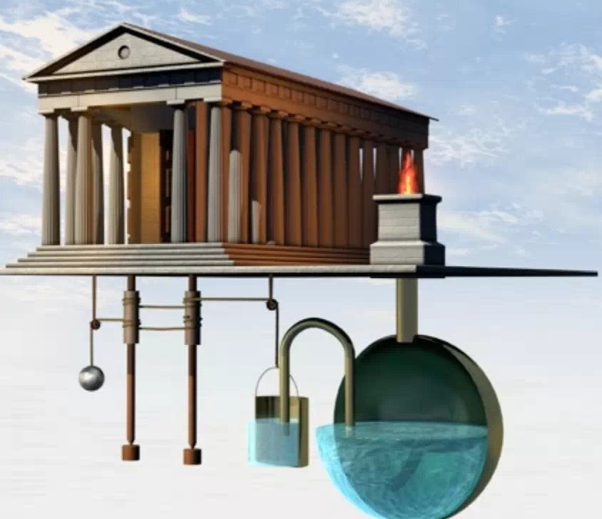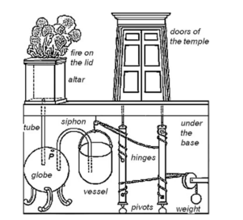 神庙门口点火,火烧水产生蒸汽,蒸汽带动其他机械结构,打开庙门。想象一下,两千年前(大约是汉朝?)的人如果看到这么个自动门,估计当即就觉得神仙显灵了,震撼不是一般的。