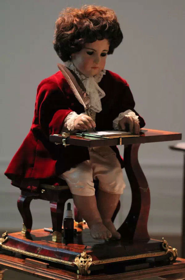这个会写字的机械人偶被认为是最早的计算机雏形。共计由六千多个部件组成,这个会写字的小男孩人偶用羽毛笔蘸真的墨水写字,而且他写字的内容还是可以“编程”的,不同的机械齿轮会使人偶的手臂做出不同的动作。