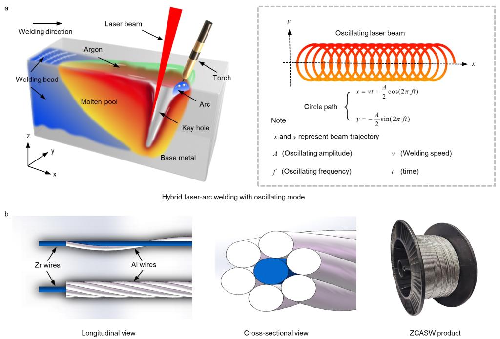针对上述问题,论文设计开发了“锆芯铝壳”新型绞股焊丝,该焊丝由1根R60702焊丝(Zr焊丝)作为中心丝、6根与母材同质的ER2319焊丝作为周围丝绞制而成,并提出了基于新型焊丝的后置激光摆动-电弧复合焊接工艺,通过电弧热源熔化焊丝、激光搅拌熔池促进合金元素均匀分布,以实现微观组织调控和凝固裂纹抑制。