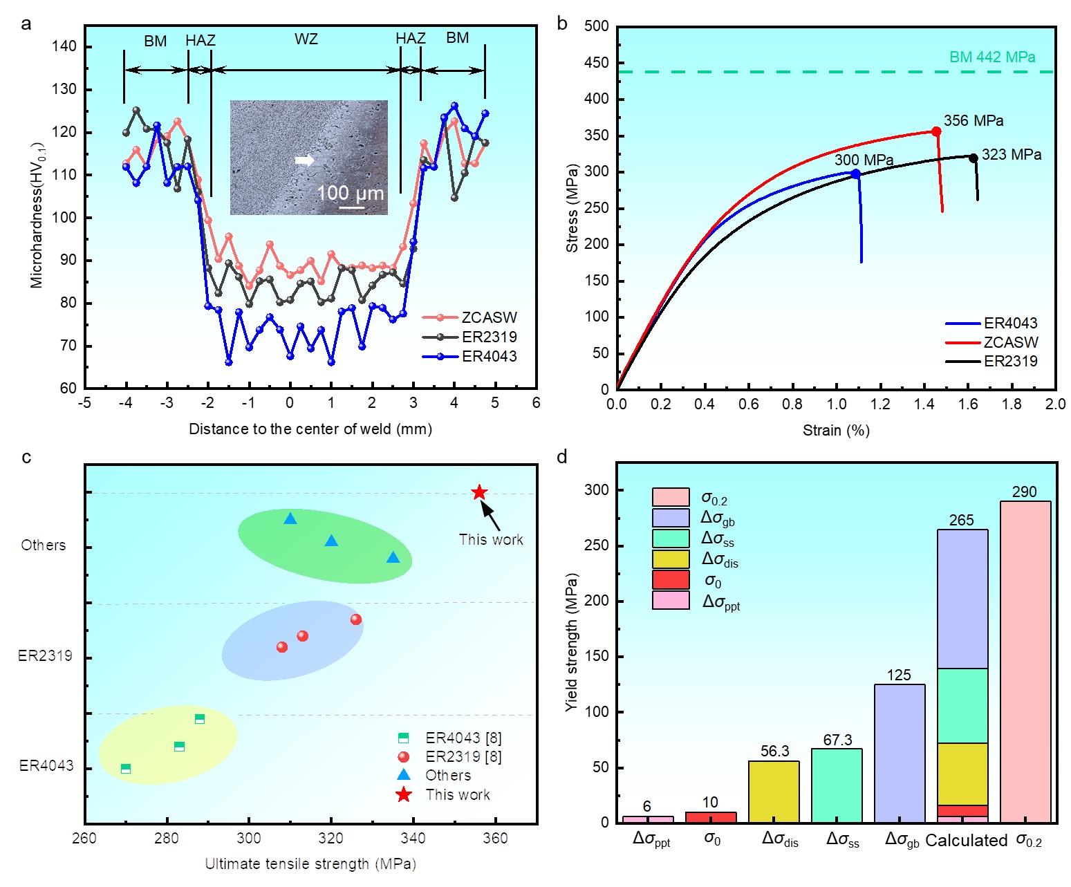 焊接接头在无热处理的条件下平均抗拉强度为349 MPa,达到2024-T4态高强铝合金熔化焊接目前公开文献报道的最优水平。基于强化机制,定量分析了细晶强化、第二相强化、位错强化和固溶强化对力学性能的贡献,发现细晶强化是导致力学性能提高的主要原因,为接头强度提高贡献47%。
