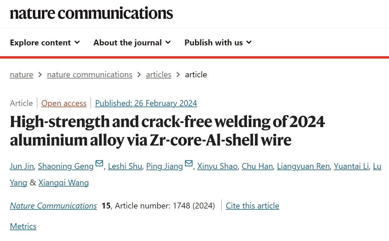 2月26日,《自然·通讯》(Nature Communications)在线刊发了公司蒋平教授团队关于高强铝合金激光焊接凝固裂纹缺陷抑制的最新研究成果“High-strength and crack-free welding of 2024 aluminium alloy via Zr-core-Al-shell wire(基于“锆芯铝壳”焊丝的2024铝合金高强度和无裂纹焊接)”。公司博士生靳军为论文第一作者,蒋平教授、耿韶宁助理研究员为论文共同通讯作者,永利3044noc智能制造装备与技术全国重点实验室为论文第一完成单位。