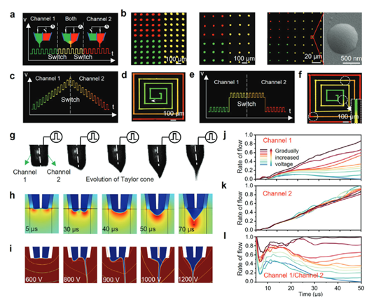 为实现具有可控材料组成的钙钛矿图案/阵列的数字喷印,研究了通道切换和波形变化对喷印结果的影响,并通过仿真研究了喷印过程中泰勒锥的变化以及溶液的混合比例变化。