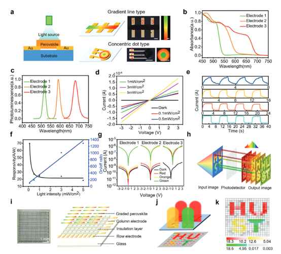 基于喷印渐变钙钛矿薄膜制备了多光谱光电探测器。所制备的器件具有高开关比(1.29×103)、低响应时间(trise = 100 ms, tfall = 60.1 ms)和高灵敏度(R = 69.88 A/W, D* = 3.27×1015 Jones)等优势,且能实现颜色识别,以及彩色图像重构等功能。