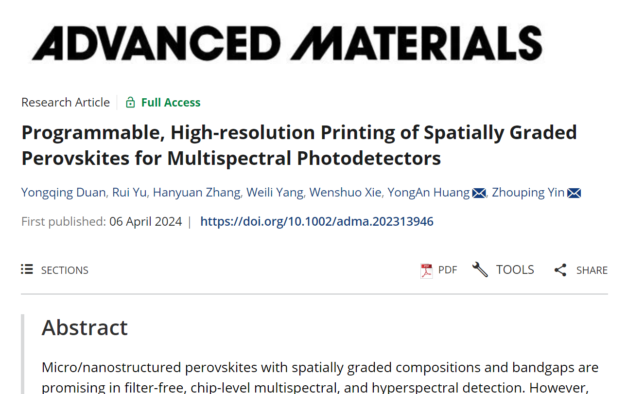 4月6日,国际权威期刊《Advanced Materials》上在线发表了题为“Programmable, High-resolution Printing of Spatially Graded Perovskites for Multispectral Photodetectors(可编程、高分辨率打印梯度钙钛矿及多光谱探测应用)”的最新研究成果。公司智能制造装备与技术全国重点实验室为论文第一完成单位,公司段永青副教授,硕士生余锐、张瀚源为本文的共同第一作者,黄永安教授和尹周平教授为本文共同通讯作者,公司博士生杨唯笠、硕士生谢文硕也参与了此项研究。
