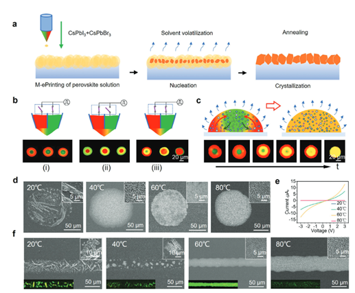 为获得质量较高、缺陷减少的钙钛矿薄膜,对喷印后的干燥退火过程进行了研究。实验发现通过控制多组分液滴在基板上的混合时间,可以实现同心圆点阵或均一点阵制备。这些新颖而可控的渐变点阵可能在高密度、带隙可调器件中具有重要应用。
