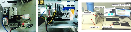 (a)置于扫描电镜下的电控多自由度纳米操作台 (b)纳米材料操作平台系统