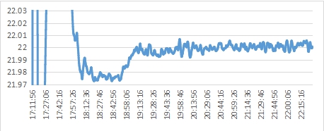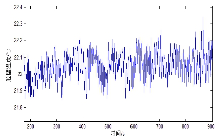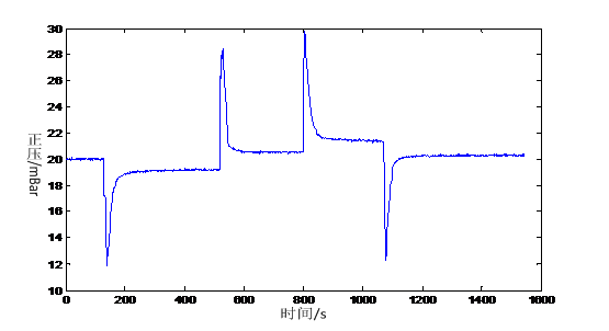 为了验证ArF光源温度和气压控制技术方案,设计了相关的验证实验。在温度控制方案验证实验中,采用一个带PTC加热器的圆柱形腔体模拟光源中的发热腔体。通过实验测得温度控制指标能达到22.05±0.2℃/5min,其实验效果如图14所示。在气压控制方案验证实验中,采用一个圆柱形空腔模拟光源中的腔体,同时在回气端安装节流阀来模拟大气压的波动。通过实验测得压力控制指标能达到20.3mBbar±1.1mBar,其实验效果如图15所示。
