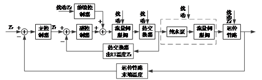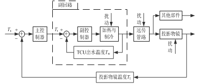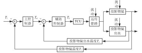 温度控制单元与光刻机投影物镜最大距离达到20米,这样循环水冷回路中存在影响投影物镜温控性能的三个因素:多重扰动、多重时滞和大惯性。为此,提出了一种内外闭环控制结构,内部串级控制结构如图2所示,外部并行控制结构如图3所示。串级控制由具有快速调节功能副回路和精确控制投影物镜温度的慢速控制回路组成,副回路不仅具有快速跟踪能力,而且对进入其内部的扰动具有很强的抑制能力。同时,它能屏蔽副控对象的非线性和时滞对主控对象的影响。外部并行串级控制与串级控制结构相比,仍然具有两个闭合回路:主回路为投影物镜内部温度环;辅助回路为投影物镜出水口冷却水温度环Tc。所不同的是,主对象和辅助对象是并行的,辅助变量不作为主变量的输入。