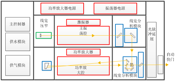 ArF光源为光刻机提供曝光成像用的准分子激光,是光刻机最关键的部件之一。在集成电路制造过程中,由于光刻机主机部件与光源远距离分离放置,光源输出光斑形状等原因,光源输出的准分子激光并不能直接用于成像曝光,而需要通过光路传输系统进行转接。ArF光源包含精密光学元件和较长的激光光路,其整机结构简图如图12所示。光源工作过程中,主振荡腔、功率放大腔等模块均会产生大量的热量,需要进行冷却。线宽压窄模块利用光学元件的色散作用进行波长选择,实现光谱线宽压缩。模块内的光栅对温度变化极其敏感,过大的温度变化会引起光栅畸变,因此需要对线宽压窄模块进行精确温度精度控制,精度要求为±0.2℃/5min。ArF激光器中,最常见失效是精密光学元件性能污染后衰减,因此,保护光学元件免受污染,是延长ArF激光器寿命的关键。目前通用的做法是对含有光学元件的模块(即蓝色模块,也包括线宽压窄模块)进行保护气体填充,模块内气压要高于模块外气压,来实现对光学元件的隔离保护与净化。微正压指标需要精确控制到20mBar±4mBar。在光路传输系统中,同样需要保护光学元件和维护输出光斑的稳定性,对光路气压和流场提出了要求。