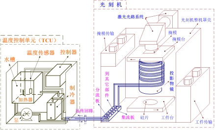 为了减小对投影光刻机的热影响和振动冲击,加热器和制冷器不允许安装在与投影光刻机的近距离处,对投影物镜的温度控制需要采用冷媒远程控制方式,最远距离要求达到20米。同时为了控制使用成本,温度控制系统要求在非恒温环境中工作。这样环境的温度波动是干扰实现投影物镜22±0.01℃的长期温度稳定性的关键因素之一。另一个关键影响因素是投影物镜参与投影光刻机的成像曝光,曝光过程中投影物镜吸收准分子激光产生热影响,抑制吸收准分子激光的热影响是温度控制物理结构和控制算法需要深入研究的内容。