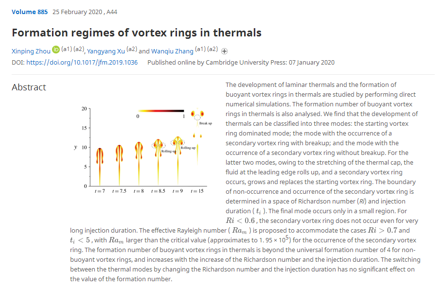 2020年JFM 885卷(2月25日)在线刊发了题为“Formation regimes of vortex rings in thermals”的研究成果。浮力驱动流体流动和涡环结构是自然界、生活和工业中的常见现象。该论文研究了热浮力涡环的发展模式,捕捉了涡环结构的演变过程,探究了理查德逊数和热流注入时间两个参数对浮力涡环发展的影响,并确定不同发展模式的分界条件。这一研究成果为浮力驱动的流体流动分析提供了新的视野。(文章链接:https://www.cambridge.org/core/journals/journal-of-fluid-mechanics/article/general-exotic-capillary-tubes/D9251A5B49367388573E6AF3B1F644A6)