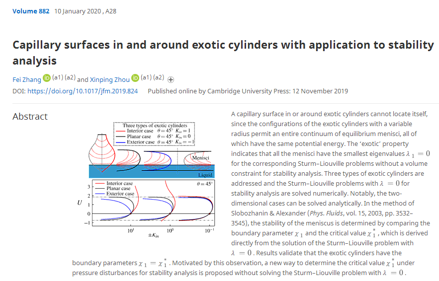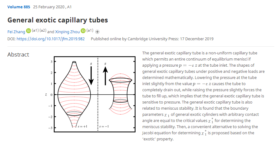2020年JFM 885卷(2月25日)在线刊发了题为“General exotic capillary tubes”的研究成果。该论文拓展了ECT的定义,并将ECT推广到负重力情形下。该文归纳了正重力下五种以及负重力下三种奇异毛细管,其中三种正重力ECT和全部负重力ECT为本文最新发现。该文进一步简化了数学模型,可以解决正负重力下及压力扰动下的轴对称单连通交界面的稳定性问题。(文章链接:https://www.cambridge.org/core/journals/journal-of-fluid-mechanics/article/capillary-surfaces-in-and-around-exotic-cylinders-with-application-to-stability-analysis/1EBAE2785C9614D1D76FDD5837D52226)