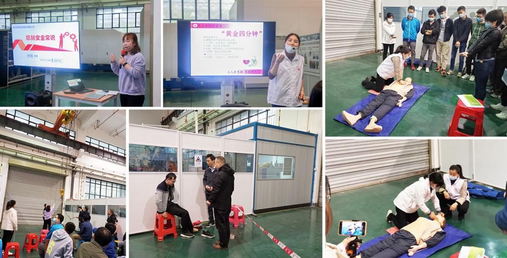 活动邀请了普和EHS技术专家进行了机械安全常识培训,让师生们对机械伤害的种类有了更多的认识。武汉市红十字会急救员培训师主要讲解了人工呼吸、胸外按压和快速除颤等为主的心肺复苏术,并邀请师生在现场动手操练。此外,还模拟了行车在起吊重物时,意外脱落砸伤路人的场景,主要应急措施为用安全警示带将事故区隔离、对伤患者进行及时止血、联系医院等环节。
