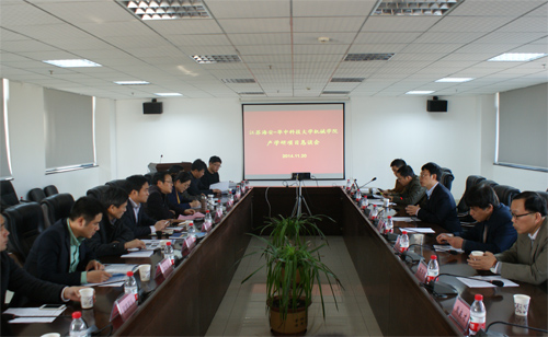 2014年11月20日,江苏省海安县锻压机械产业园管理委员会主任、李堡镇镇长郁江率园区企业家来公司召开产学研项目恳谈会,彭芳瑜副经理出席会议。