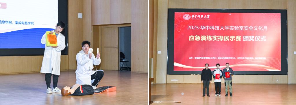 1120日,公司2025年实验室安全文化月闭幕式暨应急演练实操展示赛在光电信息大楼报告厅举行。本次活动旨在全面检验和提升师生应对实验室突发安全事故的应急处置能力,巩固实验室安全文化月建设成果。公司2024级硕士生唐鑫、2022级本科生汪杰组队参加了本次比赛,演练主题为“心肺复苏急救及AED使用方法”。两位同学在模拟突发实验室人员抢救场景时动作标准娴熟,流程清晰响应迅速,赢得了现场师生的阵阵掌声。经过现场观众投票和专家评委打分,总分位列全校前三,最终荣获本次大赛二等奖。