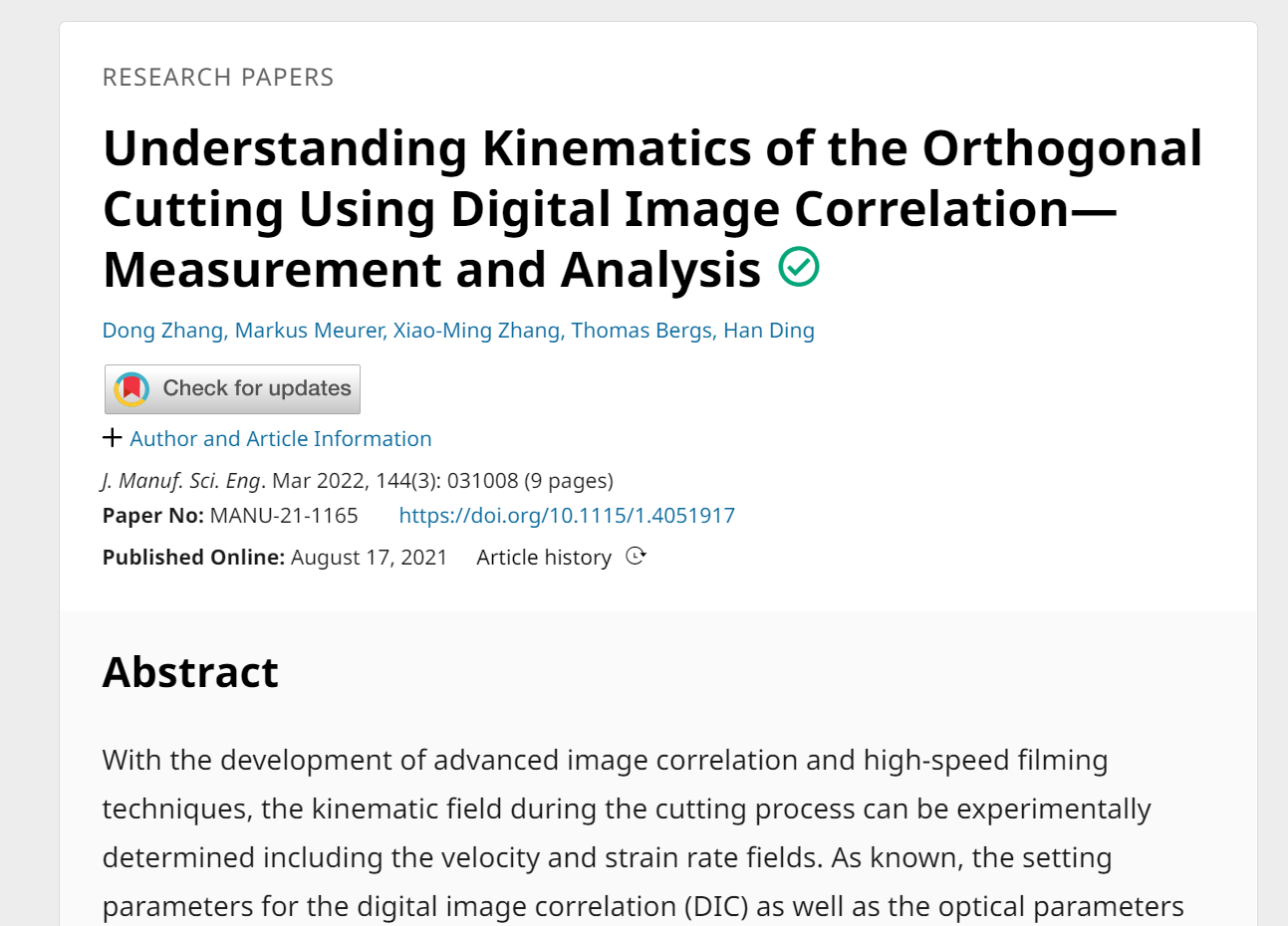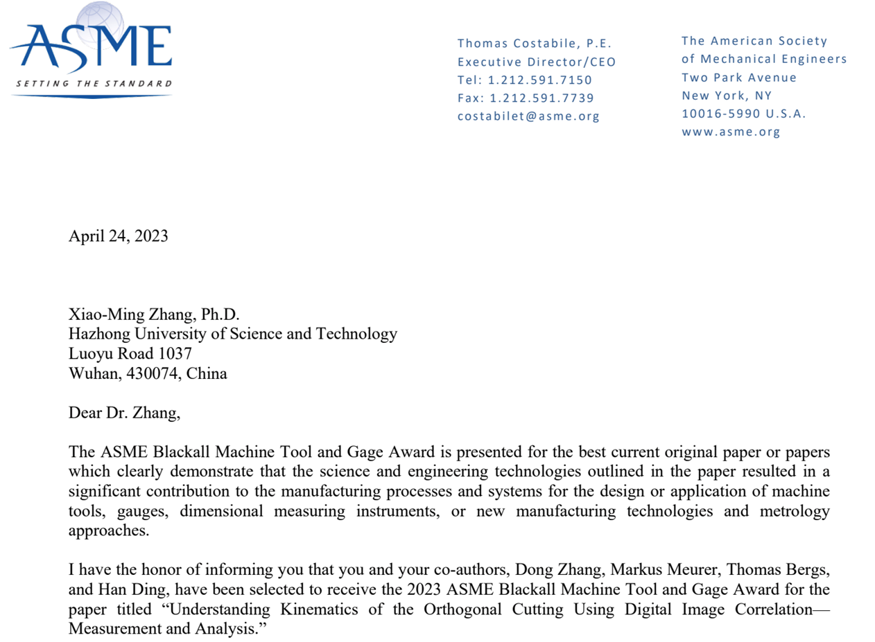 近日,美国机械工程学会(American Society of Mechanical Engineers, ASME)宣布,授予永利3044noc张小明教授、张东博士和丁汉院士2023年度“布莱克尔机床与量具奖”(Blackall Machine Tool and Gage Award),以表彰该团队切削原位成像研究工作,颁奖理由为:“这项研究开创了应用数字图像相关分析来定量测量和识别切削过程中的运动场,原位成像方法可以更好地理解材料、刀具-切屑之间的摩擦行为,并能够精确校验加工仿真。”(Citation: “This research pioneers applying the digital image correlation analysis to quantitatively measure and identify the kinematic fields during cutting process. The in-situ imaging approach gained better understanding of the material and tool-chip friction and enabling accurate validation of machining simulations.”)