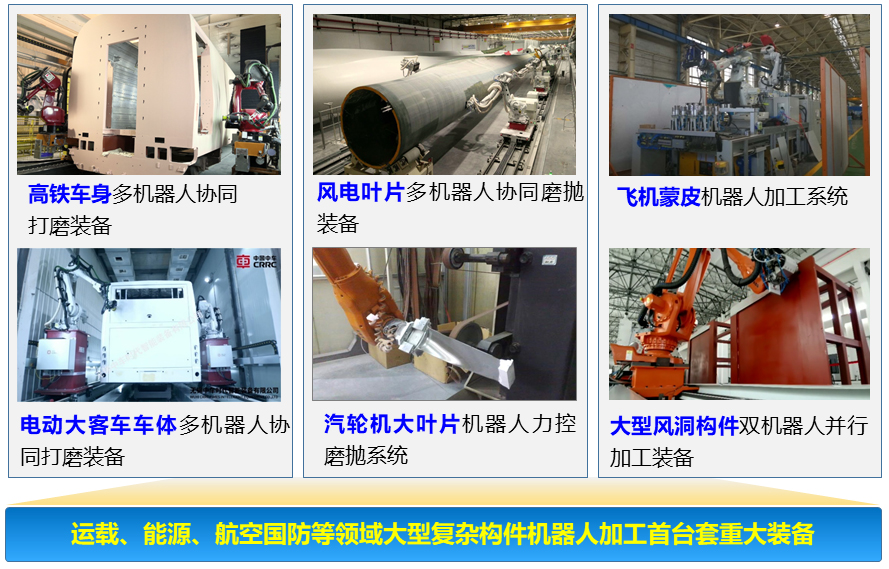 该项目围绕大型复杂曲面零件高效高品质加工这一难题,创新性提出了多机器人自律加工新原理与新模式,形成了大尺度全域测量、变曲率随形顺应、大型面平整度/粗糙度波动调控三项核心技术,研制出系列化的大型复杂曲面机器人“测量-加工”一体化首台(套)重大装备,实现了我国高铁车身、风电叶片、大型风洞构件、汽轮机大叶片从人工磨抛到机器人磨抛的技术跃升。项目成果在中国中车(青岛四方、时代新材、时代电动、南京浦镇)、29基地、无锡透平、中国商飞、中航沈飞等企业得到应用,孵化出中车时代智能、集萃华科、黎曼等一批专精特新/高新技术企业。